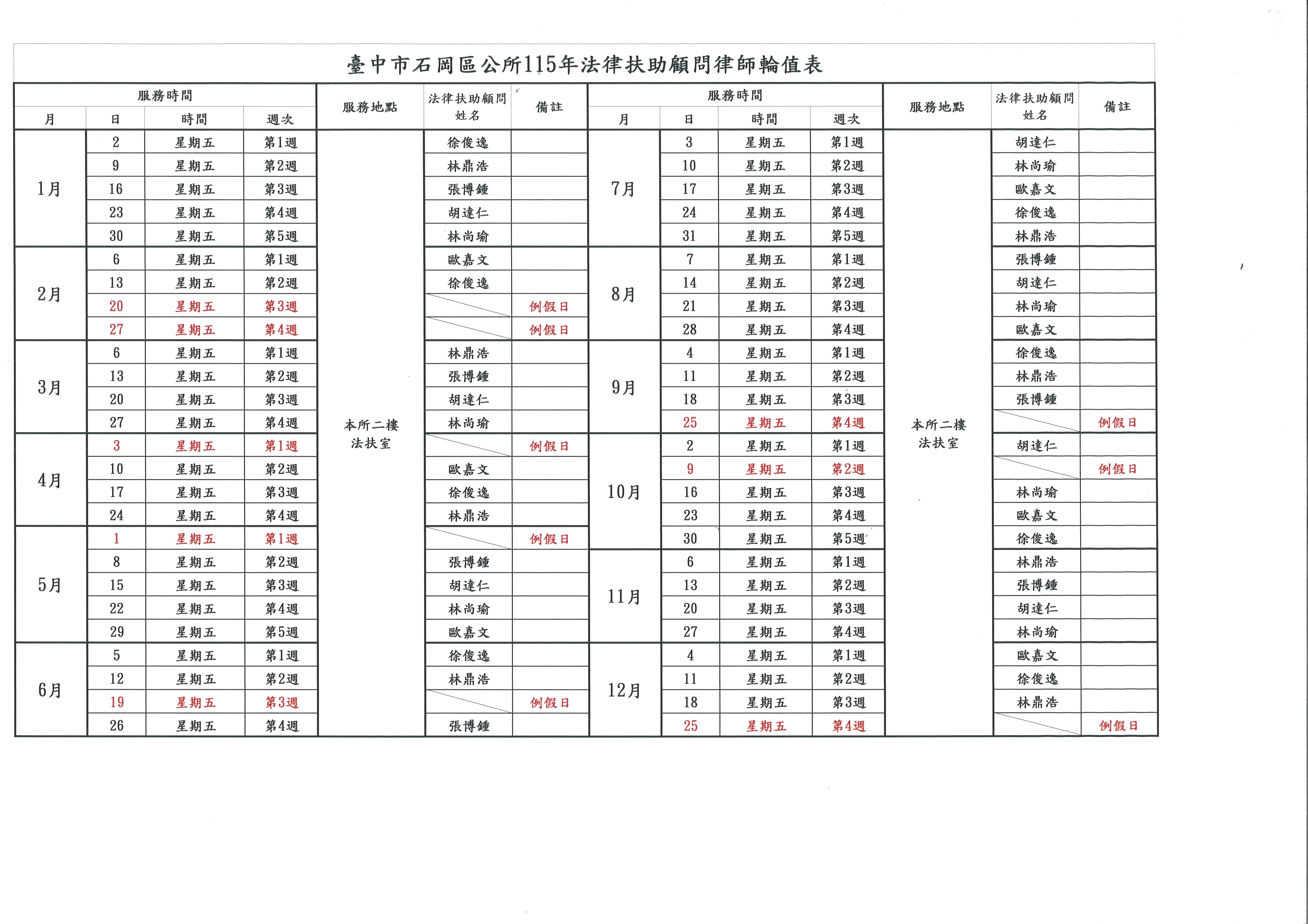 石岡區公所115年法扶律師輪值表