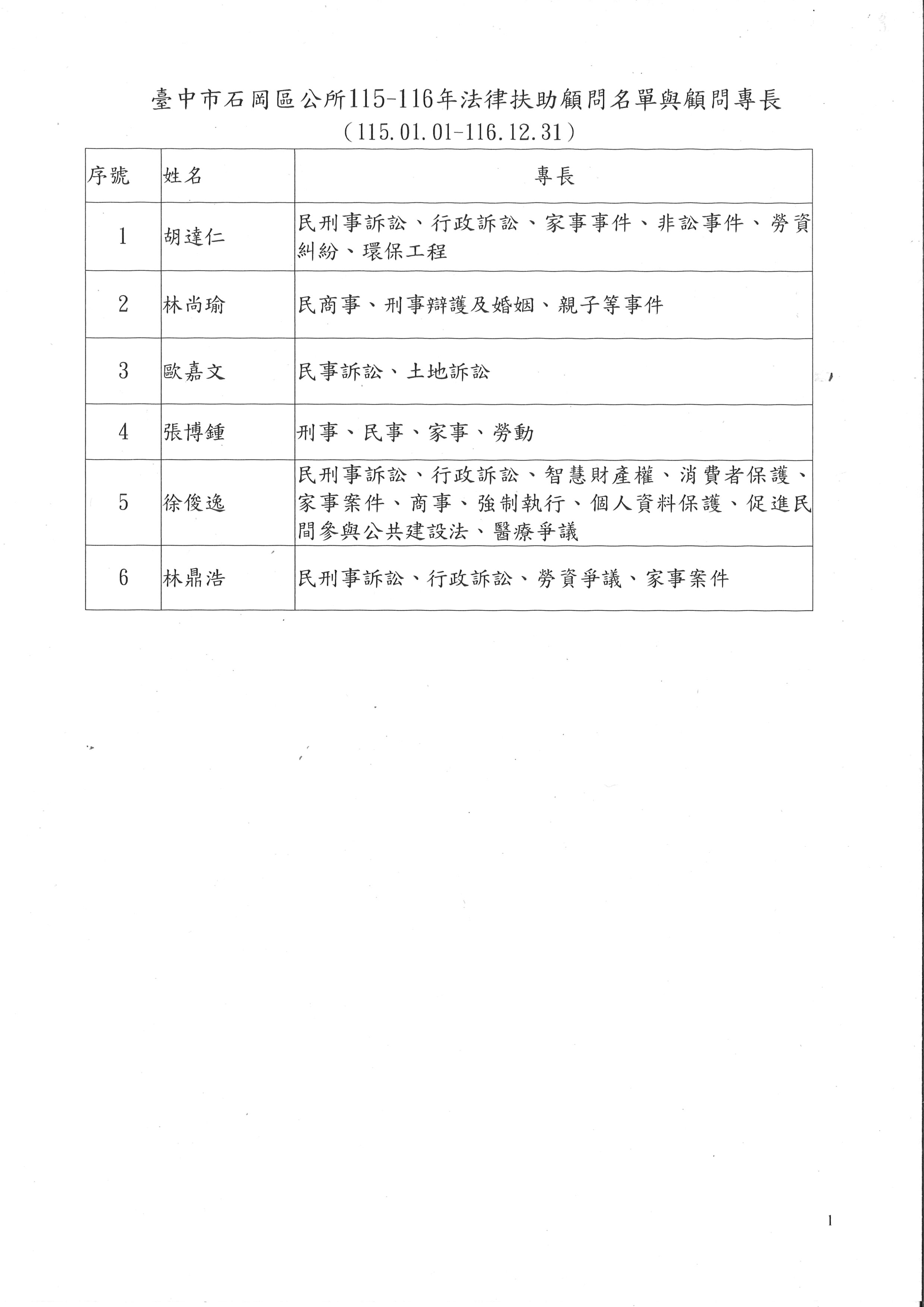 115年至116年石岡區法律扶助律師聘任名單與顧問專長-公告