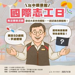 12/5是 「國際志工日」,在這個充滿意義的日子,台中願景館特別推出限定體驗活動,邀請大家一起體驗志工提供的導覽服務,了解志願服務精神~