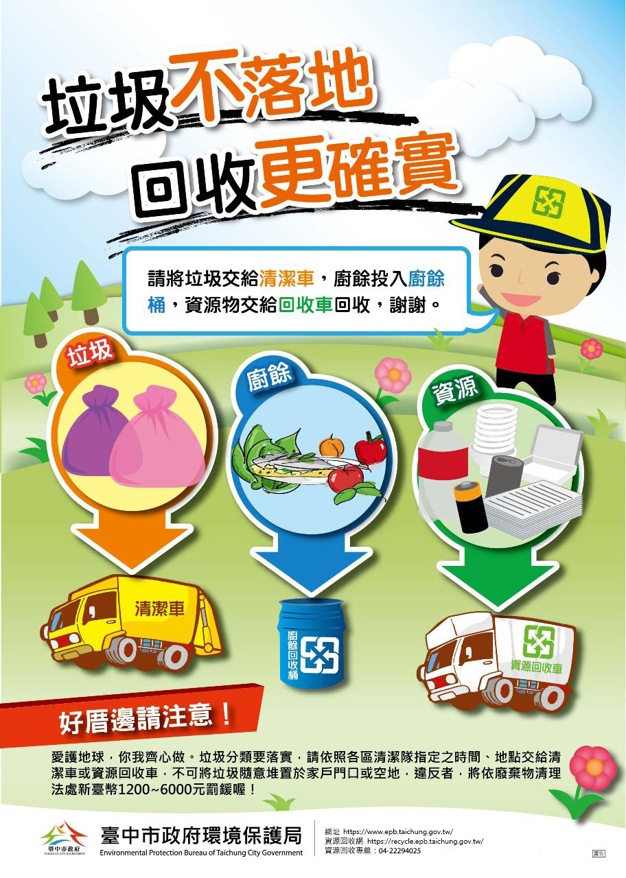 【垃圾不落地政策】 ,嚴禁將垃圾包放置於街道或定點違者可依《廢棄物清理法》處新台幣1,200 至 6,000 元罰鍰。